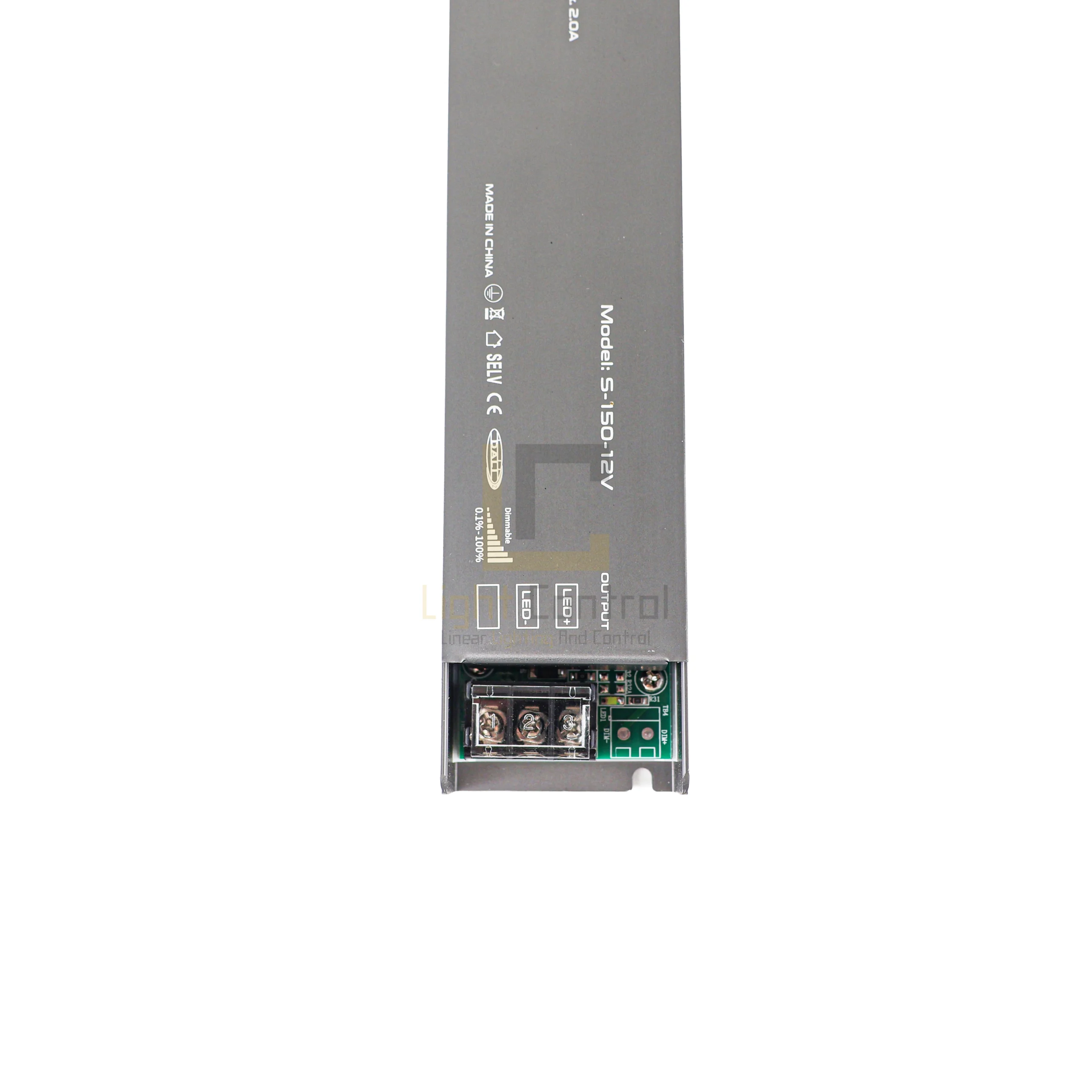 With a 12V DC output and a robust 150W capacity, it can power large sections of LED strips, spots, or modules, while delivering flicker-free, dimmable lighting control from 0–100%.